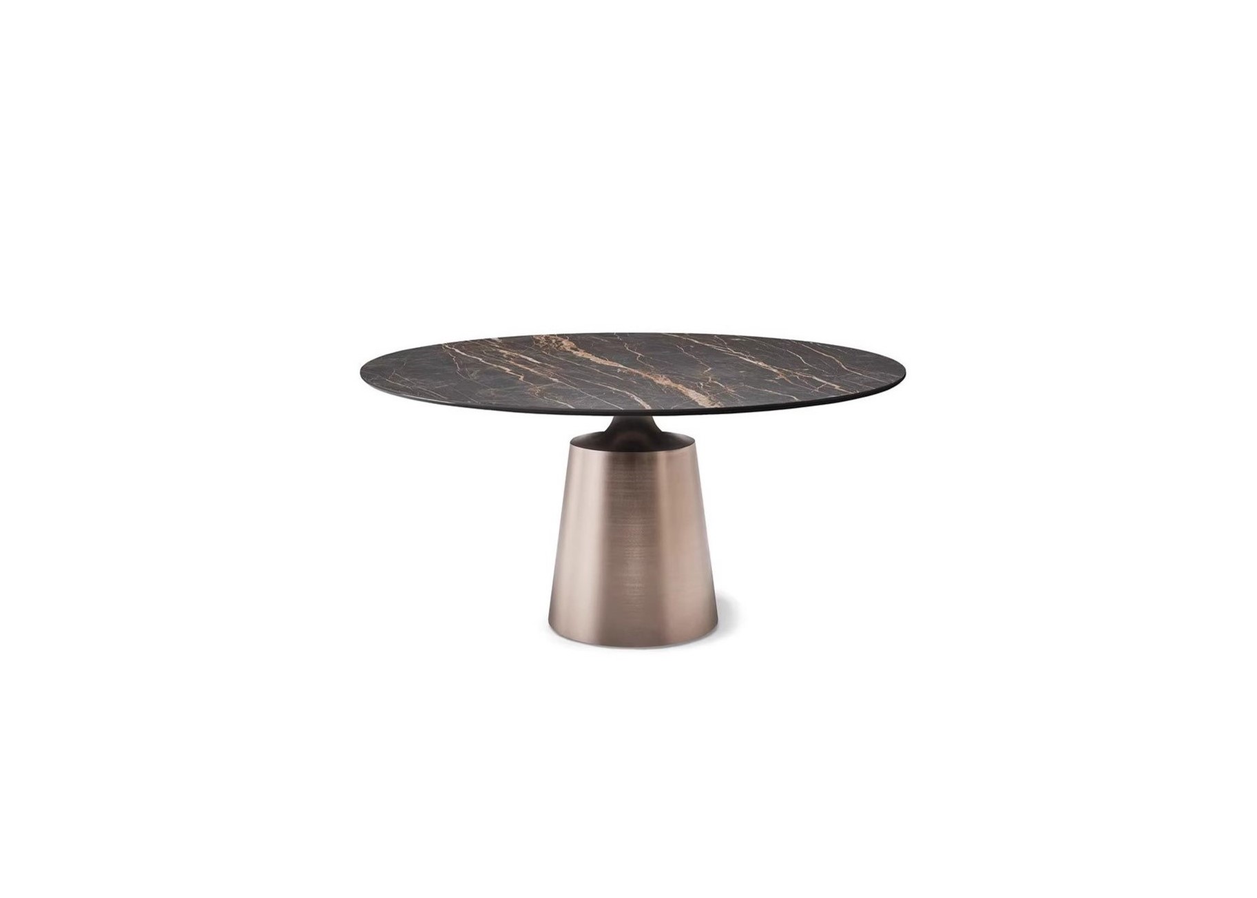 Thiết kế chân bàn dạng nón cụt trung tâm mang vẻ chắc chắn, được làm nhẹ đi nhờ lớp hoàn thiện kim loại và phần mặt bàn thu gọn, lõm vào như cổ cao thanh thoát nâng đỡ toàn bộ bề mặt.