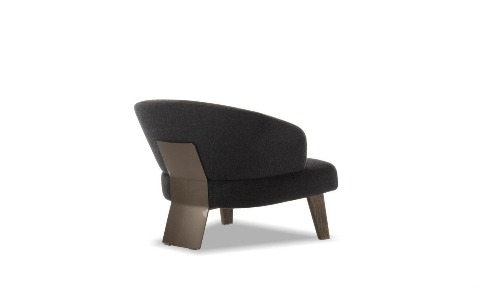 Tựa lưng được nâng đỡ bởi khung kim loại cong tinh xảo sơn đồng sáng bóng, trong khi phần trước ghế đặt trên chân gỗ Sucupira chắc chắn, hoàn thiện màu Mink sang trọng.